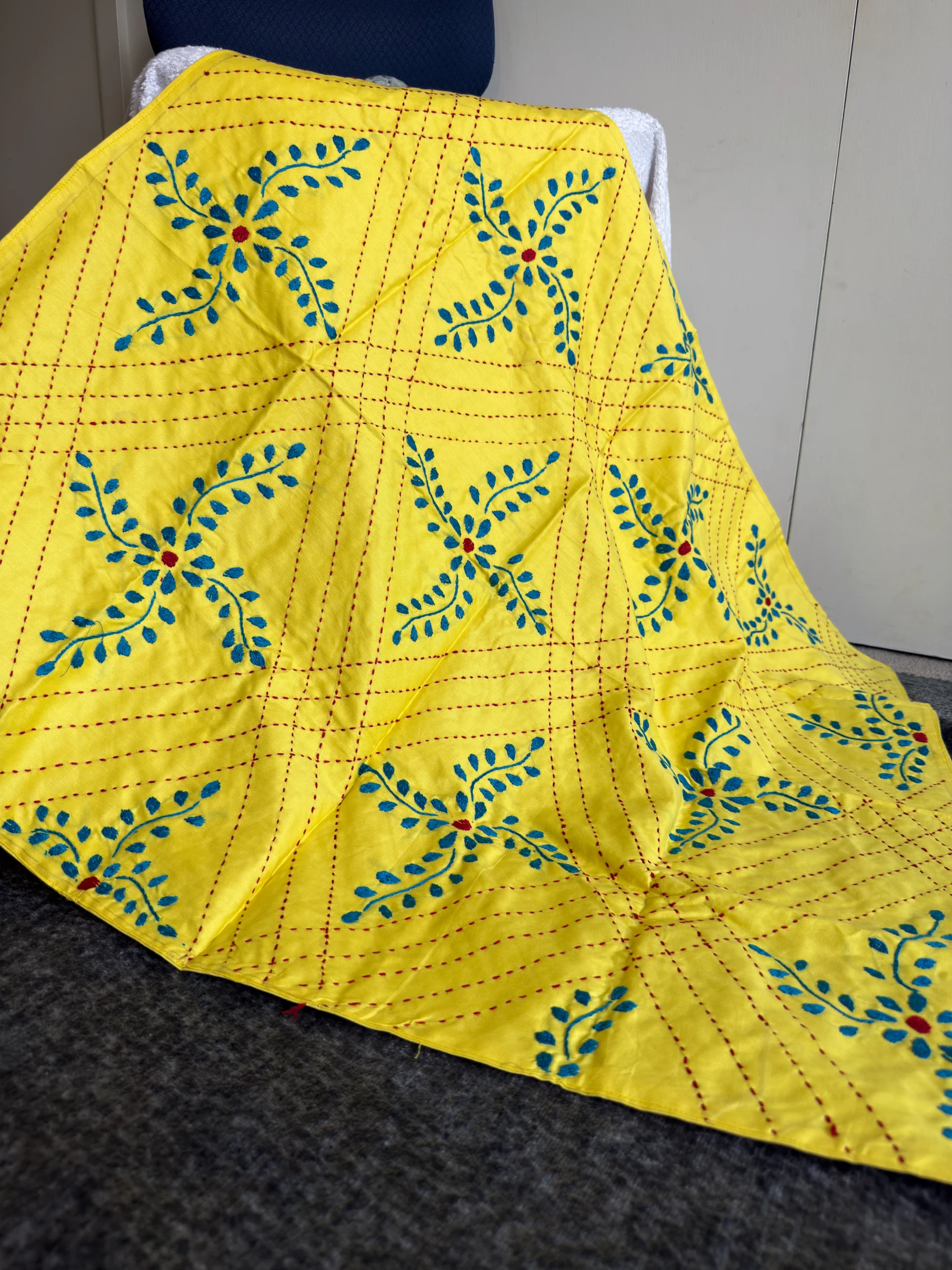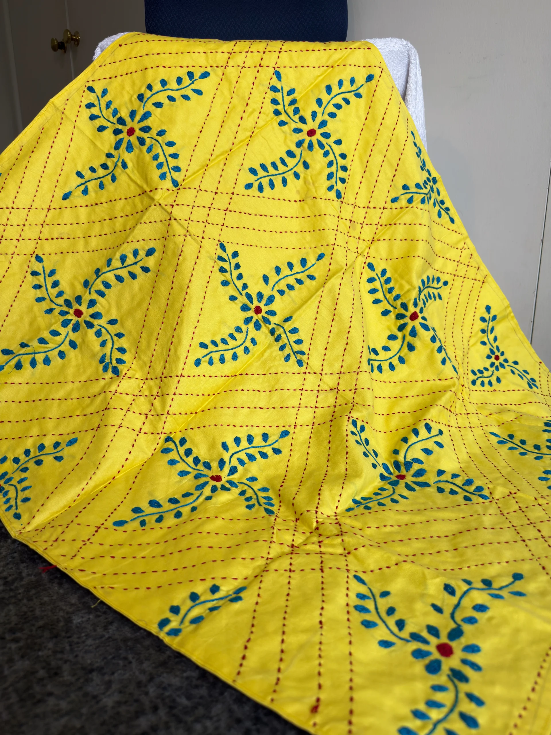 Kantha is a traditional Bengali quilting style—layers of cotton hand-quilted in running stitch and decorated with embroidered motifs. Soft, lightweight, and made to be used every day—personalised with a name, date, and a short line (4–5 words).