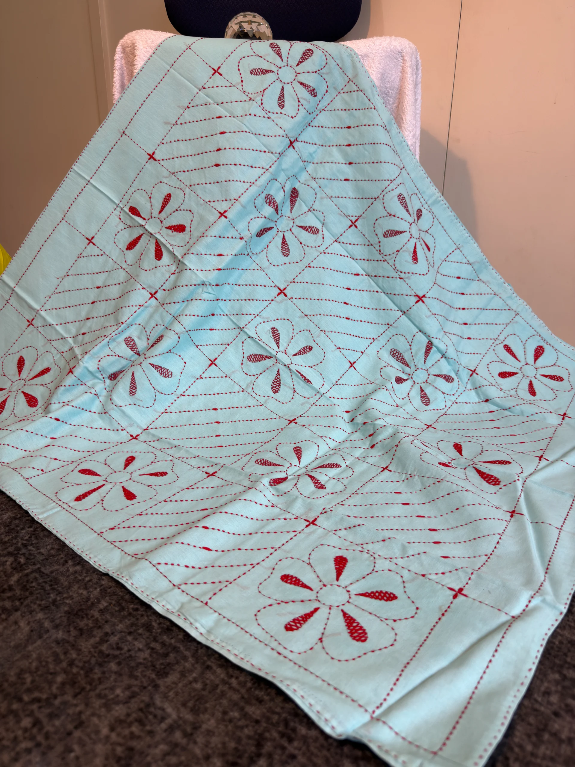 Kantha is a traditional Bengali quilting style—layers of cotton hand-quilted in running stitch and decorated with embroidered motifs. Soft, lightweight, and made to be used every day—personalised with a name, date, and a short line (4–5 words).