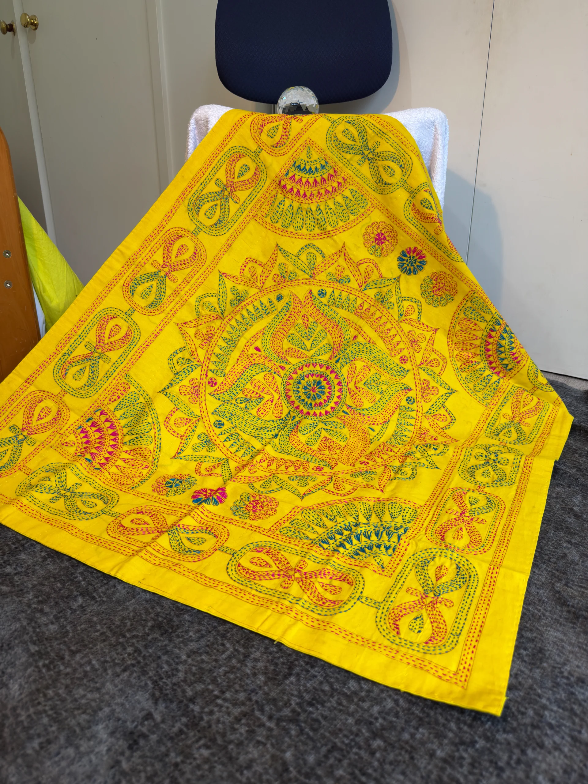 Kantha is a traditional Bengali quilting style—layers of cotton hand-quilted in running stitch and decorated with embroidered motifs. Soft, lightweight, and made to be used every day—personalised with a name, date, and a short line (4–5 words).